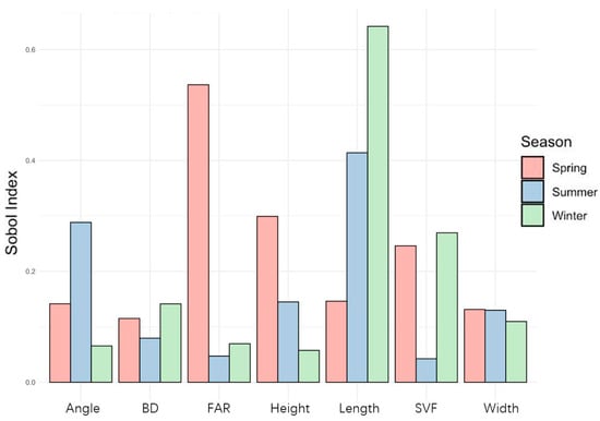 Secondly, Sobol’ sensitivity analysis provides critical insights into how various design factors, such as building dimensions, density, and orientation, influence thermal comfort. It identifies key variables, notably building spacing, which significantly affects seasonal thermal comfort—evident from Sobol’ indices of 0.41 in summer and 0.64 in winter. Such analysis underscores the importance of building layout optimization in enhancing thermal conditions year-round, guiding stakeholders in decision-making for sustainable environmental design.