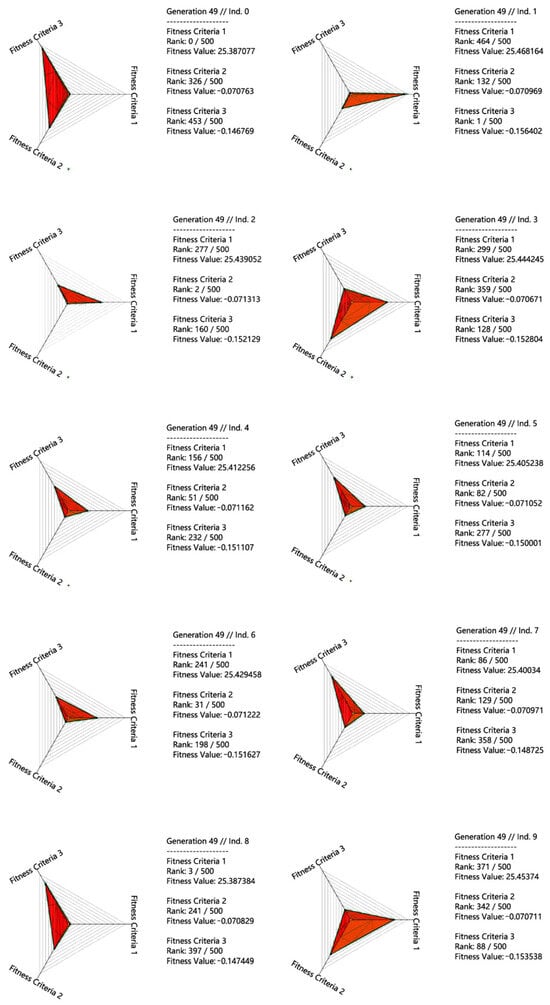 By applying the NSGA-II algorithm, Grasshopper automatically iteratively optimizes the shape and arrangement of 20 building units to achieve the best combination of the building size and form while ensuring maximum thermal comfort. Each iteration selects and generates new populations through non-dominated sorting and crowding distance calculations. This process was set up to continue for a total of 50 generations, resulting in a series of architectural design solutions that provide excellent thermal comfort in all three seasons. These deconstructions form the Pareto frontier of our research, supporting further design.