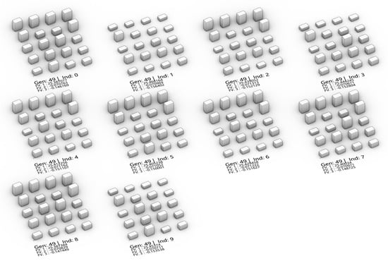 Figure 13 shows the model of the 49th generation solution set. It shows the morphology of the last generation model, which is the relatively optimal generation solution generated according to the genetic algorithm. Through analysis, it is concluded that in the relatively better layout, the value range of BD is 0.138–0.154, the value of FAR is 2.136–2.696, and the value of SVF is 0.756–0.849. The values of BL, BW and BH are 50–52, 15–16 and 33.75–49.5 (m), respectively. The ARS values are relatively stable, all of which are 15°. It can be seen from Part 3.3 that the Sobol’ indices of BL and ARS are high, and the value range of these two values is also relatively accurate, which has a high reference value in the design of residential areas.