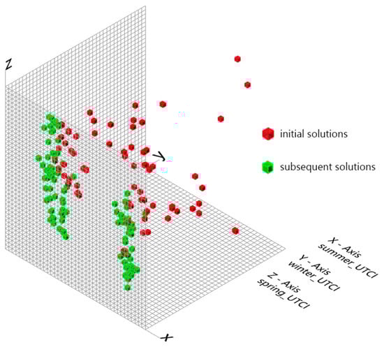 Figure 14 shows objective space for the entire population. The visualization of the optimization process presents a clear evolutionary trajectory, transitioning from initial solutions to those refined in later stages. Initially marked in red, the solutions are scattered across a three-dimensional space delineated by the UTCI values for summer, winter, and spring. This broad dispersion highlights an extensive exploration of the design space, illustrating the diverse range of potential strategies for achieving thermal comfort across different seasons. The spatial segregation between the initial and optimized solutions underscores the efficacy of the evolutionary algorithm. While the initial red points are widely dispersed, indicating initial uncertainty or exploration within the objective space, the optimized solutions, marked in green, tend to cluster towards specific regions. This clustering pattern indicates that the algorithm has pinpointed design configurations that offer significant advantages for meeting multi-seasonal thermal comfort objectives. Moreover, the visualization reveals that the distribution of optimized solutions is not uniform across all axes, suggesting that the optimization’s effectiveness varies with seasonal conditions. The green points are more closely grouped along the summer UTCI axis compared to the winter UTCI axis. This tighter clustering for summer conditions may reflect the inherent challenges associated with higher temperatures and solar gains during this season, pointing to a convergence of solutions that more effectively address these specific seasonal dynamics. In conclusion, it not only validates the algorithm’s ability to improve over time but also provides a basis for understanding how different seasonal thermal comfort conditions can be addressed through computational design strategies.