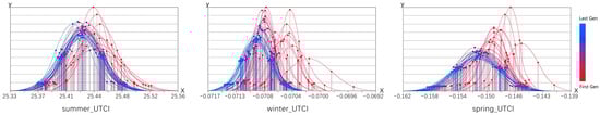 In the optimization process, a notable trend emerges from the standard deviation graphs of the UTCI values for summer, winter, and spring. The progression of generations, depicted by the transition from warm to cool colors, reveals a consistent shift towards more favorable UTCI values. This leftward shift in the distribution suggests a convergence towards optimal thermal comfort settings.