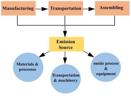 The assessment of CO2 emissions in as-built prefabricated structures using digital tools like BIM involves the evaluation of the environmental impact of construction activities and materials throughout the construction phase, where BIM integrates various data sources and simulation tools like Rhino and grasshopper to model and analyze building components, energy consumption, and emissions. The literature describes the utilization of BIM to quantify the carbon emissions associated with different stages of prefabricated building construction, including manufacturing, transportation, and assembling; by leveraging BIM technology, stakeholders can make informed decisions to calculate carbon emissions and promote sustainable construction practices []. The three main stages of prefabrication where one can evaluate carbon emissions are shown in Figure 1.