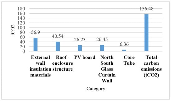 The carbon emissions calculated for the material production stage are further divided into five phases, i.e., external wall insulation materials: 56.90 tCO2; roof enclosure structure: 40.54 tCO2; PV board: 26.23 tCO2; north–south glass curtain wall: 26.45 tCO2; and core tube multi-category material extraction: 6.36 tCO2. The total amount of carbon emissions is 156.50 tCO2, as shown in Figure 5.