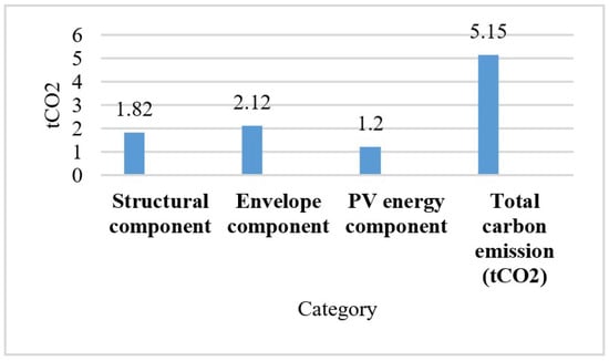 The carbon emissions calculated for the component manufacturing stage are further divided into three phases, i.e., structural components: 1.82 tCO2; envelope components: 2.12 tCO2; and PV energy components: 1.20 tCO2. The total amount of carbon emission is 5.15 tCO2, as shown in Figure 6.