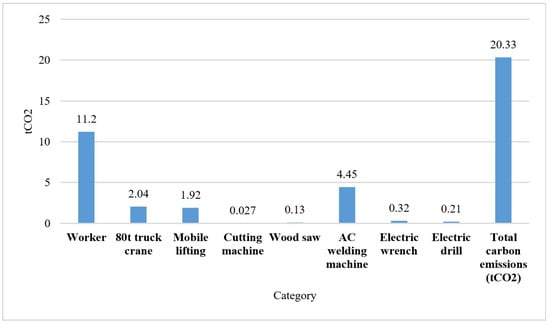 The carbon emissions calculated for the assembling stage are further divided into eight phases, i.e., workers: 11.2 tCO2; 80 t truck crane: 2.04 tCO2; mobile lifting: 1.92 tCO2; cutting machine: 0.02 tCO2; wood work saw: 0.13 tCO2; AC welding machine: 4.45 tCO2; electric wrench: 0.32 tCO2; and electric drill: 0.21 tCO2. The total amount of carbon emissions is 20.33 tCO2, as shown in Figure 8.