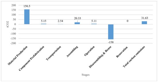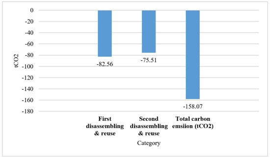The carbon emissions calculated for the disassembling and reuse stage are further divided into two phases, i.e., the first disassembling and reuse: −82.56 tCO; and the second disassembling and reuse: −75.51 tCO. The total amount of carbon emission is −158.07 tCO, as shown in Figure 10.
