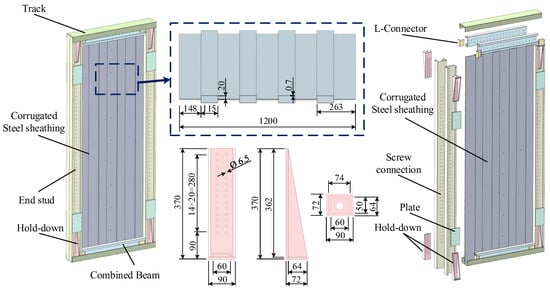 As a response to the limited strength and ductility of conventional CFS shear walls, this paper presents an innovative CCS-CFS shear wall with corrugated steel sheet central sheathing, as depicted in Figure 1. In this configuration, two back-to back corrugated steel sheets were centrally confined within the framing, providing a substantial increase in both shear resistance and ductility in comparison with conventional shear walls. The corrugated steel sheets were sandwiched by built-up vertical studs along the edges and horizontal members located at the base and top of the wall. Additionally, L-shaped connectors were used to connect the studs and the horizontal members, enhancing the overall stability of the shear wall through improved component connections. Furthermore, a symmetrical arrangement of hold-downs on both sides of the wall was employed to enhance connection performance and prevent hold-down failure or damage.