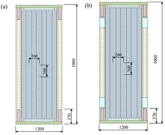 Two full-size CCS-CFS shear wall specimens were designed and manufactured. The height and width of all specimens were 3000 mm and 1200 mm, respectively. The transverse brace comprised double C-shaped steel with 140 mm web × 55 mm flange × 25 mm lip × 2 mm thickness, fastened together by two lines of screws at intervals of 50 mm along the length of the web. The end studs consisted of two coupled C-shaped steel with 140 mm web × 75 mm flange × 25 mm lip × 2 mm thickness, fastened together by two lines of screws at intervals of 50 mm along the length of the web. The track comprised double U-shaped steel with 160 mm web × 70 mm flange × 2 mm thickness attached by two lines of SPRs at intervals of 50 mm along the length of the web. The interval between the two lines of screws was 40 mm. The cross-section size of the corrugated steel sheet was CS 1200 mm × 148 mm × 115 mm × 20 mm, with a thickness of 0.7 mm. The end studs of specimen SW-1 were not equipped with plates, while the end studs of specimen SW-2 were equipped with plates. Figure 2 presents the detailed configurations of the specimens.