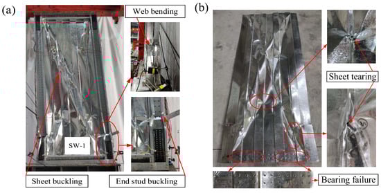 Failure modes of SW-1: (a) specimen SW-1; (b) corrugated steel sheet.