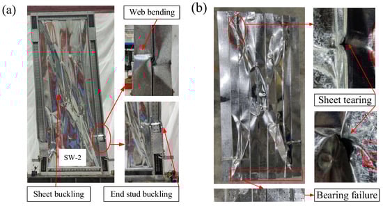 Failure modes of SW-2: (a) specimen SW-2; (b) corrugated steel sheet.