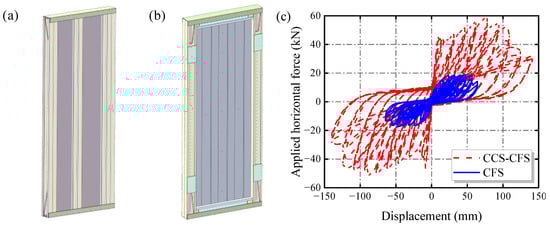 Based on the test results obtained by Xie et al. [27], this section presents a comparison of the hysteretic curves and seismic performance indexes between the conventional CFS shear wall (Figure 6a) and specimen SW-2 (Figure 6b). The results of the comparison of hysteresis curves are displayed in Figure 6c. As depicted in Figure 6, specimen SW-2 demonstrated an approximately 60% increase in steel usage compared with the conventional CFS shear wall. Nevertheless, notable enhancements were observed in its shear stiffness, shear strength, and cumulative energy consumption, with increases of 267%, 208%, and 175%, respectively. In summary, the seismic performance of the CCS-CFS shear wall markedly improved compared with the conventional CFS shear wall. Hence, it is advisable to consider employing the CCS-CFS shear wall as a prospective lateral force resistance solution within a multi-layer CFS structure system.