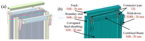 Finite element model of the CCS-CFS shear wall: (a) schematic diagram; (b) finite element model.