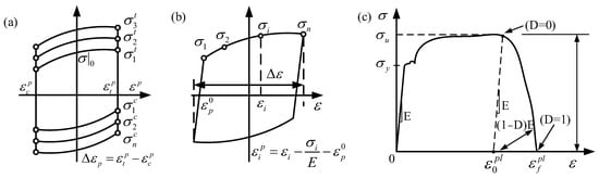 Furthermore, steel material properties were determined according to coupon tests. The nominal stress () and strain () data were obtained from the material test (Table 1), and transformed into the input true stress () and strain () based on Equations (1)–(3) [32], as displayed in Figure 8b. Figure 8c depicts the true stress–strain curve of steel under tension. In order to achieve a more precise simulation of the failure behavior of the shear wall, ductile damage properties were incorporated into the material constitutive model. Additionally, the damage evolution sub-term of the steel damage evolution path was included.