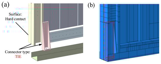 Figure 11 presents a simplified diagram of the hold-downs in the finite element model. During the cyclic loading tests, no damage was observed on the hold-downs, and they consistently remained within the elastic range. Therefore, the solid unit C3D8R was employed to simulate the hold-downs, and the constraint between it and the end stud was simplified to the TIE constraint.