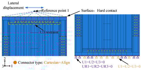 According to the test, the simulation of the boundary conditions of the CCS-CFS shear wall was primarily divided into the following: (1) The relationship between the top track and the loading beam. The web plate of the upper track was coupled to the reference point RP-1, and the translation degree of freedom in the loading direction was constrained. (2) Preventing out-of-plane instability of the wall during loading. The translation degree of freedom in the external direction of the wall was restricted. (3) The connection between the bottom track and the beam. The translation degree of freedom between the bottom track and the hold-downs was restricted. (4) Surface-to-surface contact with ‘‘hard-contact’’ behavior in a normal direction was introduced to simulate the interfaces between the frame members and the sheet. Additionally, the tangent behavior of interfaces was defined as frictionless, as depicted in Figure 12. To improve convergence in the analysis and acquire a hysteresis curve featuring a descending branch, we employed a monotonic loading scenario utilizing displacement-control loading within the model.