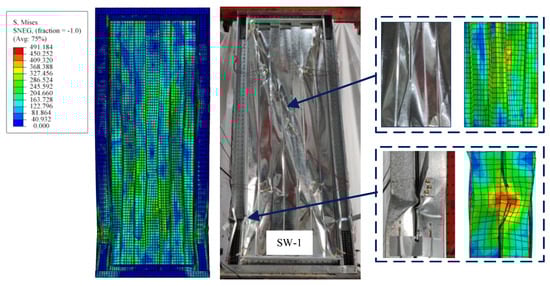 As depicted in Figure 13, the stress concentration in both specimens was primarily located in the compressed side studs (near the bottom hold-downs), which was consistent with the test results. In addition, the tension bands of both corrugated steel sheets were formed along the diagonal of the wall, which was in agreement with the test results. In summary, the failure mode observed in the finite element model aligned with the experimental results, thus validating the method used for modeling the CCS-CFS shear wall.