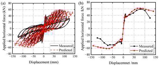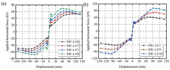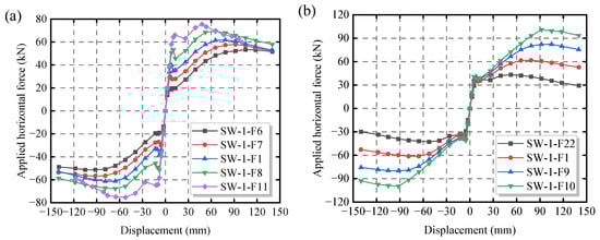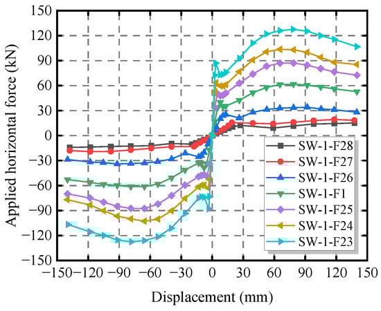 The test and finite element analysis hysteretic curves are displayed in Figure 14. For specimen SW-1, the hysteretic curve derived from the finite element analysis closely matched the test results, exhibiting a distinct decline section. Compared with the test results, the displacement of the finite element analysis curve in the falling section was larger. This variation could be attributed to the TIE constraint applied in certain connections of the wall, potentially resulting in slightly increased ductility of the shear wall in the simulation compared with the test specimen. However, as can be seen in Table 5, it is evident that the relative error between the test results and the finite element results was maintained within 12%, which meets the requisite standards in the field of civil engineering and enables subsequent parameter analysis.