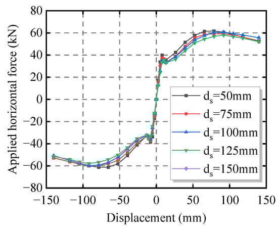 To investigate the effect of the screw spacing on the seismic performance of the CCS-CFS shear wall, five finite element models were designed with different screw spacings 50 mm, 75 mm, 100 mm, 125 mm and 150 mm [34,35]. The skeleton curves for these models are presented in Figure 15.
