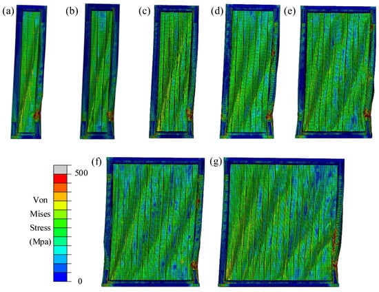 Failure modes of CCS-CFS shear walls under different aspect ratios: (a) 4.45:1; (b) 3.96:1; (c) 3.00:1; (d) 2.5:1; (e) 1.74:1; (f) 1.33:1; (g) 1.08:1.
