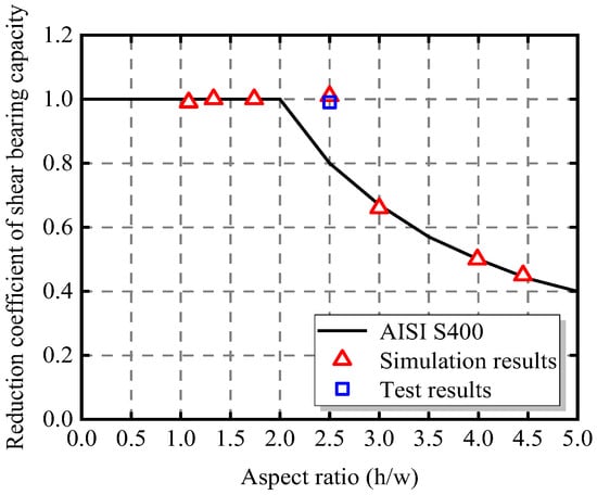 The relationship between the reduction coefficient of shear strength and the aspect ratio of the CCS-CFS shear wall is illustrated in Figure 21. The reduction factor of shear strength for CCS-CFS shear walls with different aspect ratios is more conservative when determined according to the method recommended by AISI S400. Under reciprocating loading, the shear strength of CCS-CFS shear walls approached unity when the aspect ratio was less than 2.5. To summarize, the effect of aspect ratio on the shear strength of CCS-CFS shear walls can be directly considered using the North American standard AISI S400 [36] and the aspect ratio limit for CCS-CFS shear walls can be relaxed to 10:4.