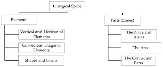 Space is a prime ingredient in a designer’s palette and the quintessential element of interior design. Through the volume of space, participants see forms, hear sounds, feel gentle breezes and the warmth of the sun, and smell the fragrances of flowers in bloom. Space inherits the sensual and aesthetic characteristics of the elements in its field [5]. The objective of this study was to assess the elements of design that are most seen by participants in the liturgical space of church buildings. In this study, nine churches in the city of Mosul were selected as notable cases in Iraq. The case study was evaluated using a software tool (visual attention software) to test the theoretical frame vocabularies on the study samples. This study endeavored to highlight the most-seen elements to be used as a model in the field of liturgy and architecture. The main approach discussed in this paper will begin with an examination of space elements, followed by a discussion of liturgical parts (see Figure 1).