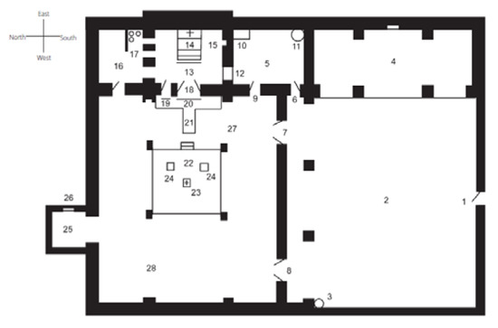 The term “Christian Church” refers to the collective group of all Christians [13]. Most English translations of the New Testament generally use the word “church” as a translation of the Ancient Greek term “Eκκλησία” (transliterated as “ecclesia”) found in the original Greek texts, which generally meant an “assembly” [14]. A Nestorian church is traditionally a rectangular building with one or three naves, built of stone or fired clay. The choir is oriented toward the east, where the sun rises and whence Christ will appear on Judgment Day (Matt 24:27). The entrance doors for people are found on the southern wall. Sometimes there are two doors, one for each sex. The interior is divided into three parts along both axes. To the east and in the center is the Holy of Holies (and the choir), which symbolizes heaven and can only be entered by clergy of the rank of deacon or above. The Holy of Holies is raised on three levels. A stone or wooden choir screen, with one to three arches, divides the nave from the choir; it corresponds to the iconostasis of Orthodox churches. Today, the choir screen is rarely seen, but the curtain, as in Syrian Orthodox churches, remains. Between the nave and the choir is the qostroma, which means vestibule, raised up by three steps. In earlier times, the center of the nave featured a rectangular or horseshoe-shaped platform called the bema, which symbolized Jerusalem as the center of Jesus’s life [4] (see Figure 2).