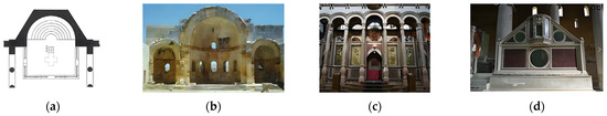 (a) Reconstructed plan of bema with semi-circular synthronon, St. John Stoudios, Constantinople [16]; (b) The triple–apsed sanctuary of the eastern Basilica arm of St. Simeon Stylites [20]; (c) colored marble iconostasis, the Church of the Holy Sepulture, Jerusalem [21]; and (d) ambo, St. Lorenzo Fuori le Mura Church, Rome, 12th Century [22].