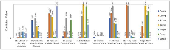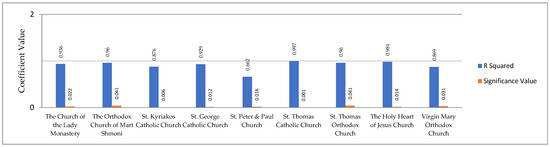 The significant value for each church is compared with (0.05) for the best strength of impact. In the Syriac Catholic Church of St. Thomas, the significant value carried a high impact because it was less than the assumed significant value (0.05). Next came the Catholic Church of St. Kyriakos with a value of 0.006, the Catholic church of St. Georges with a value of 0.012, the church of the Holy Heart of Jesus Christ with a value of 0.014, the Church of St. Peter and Paul with a value of 0.016, the church of the Lady Monastery with a value of 0.022, the Orthodox Church of the Virgin Mary with a value of 0.031, and, finally, both of the Orthodox Churches of Mart Shmoni and St. Thomas with a value of 0.041, as clarified in (Figure 8).