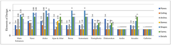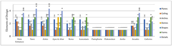 Additionally, the probability of visual fixation within 3–5 s had less impact in the Orthodox Church of Mart Shmoni. The sig. values for each of the elements of design were as follows: the visual fixation of the forms had a high impact, with a sig. value of 0.009; next came the visual fixation of each of the details, ceiling, shapes, domes, and planes, with sig. values of 0.020, 0.023, 0.196, 0.344, and 0.527, respectively; and finally, the visual fixation of the arches obtained a sig. value of 0.582 (see Table 5 and Figure 10 and Figure 11).