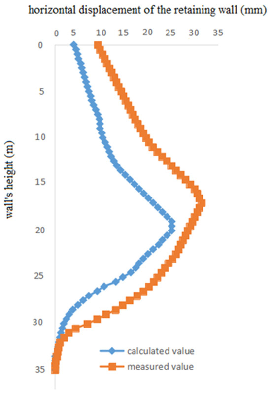 The outcomes presented in Table 2 show that the horizontal displacements at the top of the wall, obtained by applying the method introduced in this study, are consistently smaller than the measured values. The maximum deviation rate is 9.2%, while the minimum is 4.4%. Nevertheless, the deviation between the calculated and measured values falls within the acceptable range of 10%, indicating that the proposed method is reliable and applicable. Conversely, the horizontal displacements at the top of the wall calculated in the literature [16] deviate significantly from the measured values, with a maximum deviation of 28.2% and a minimum deviation of 1.4%.