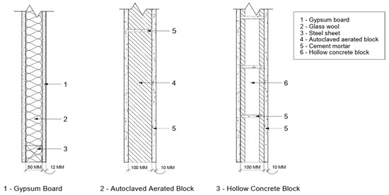 - Design stage: Figure 2 shows the studied alternatives for lightweight partitions: gypsum board, autoclaved aerated concrete blocks, and hollow concrete blocks. The alternatives were designed to meet local standards [26,27,28,29].
