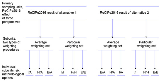 Figure 3 shows the design framework of the six methodological options of ReCiPe2016. This design framework permits the use of a two-stage nested analysis of variance to compare the two primary sampling units, where each primary sampling unit contains two subunits and each subunit contains three individual subunits [38]. Recently, this statistical approach was applied to compare two building LCAs [39].