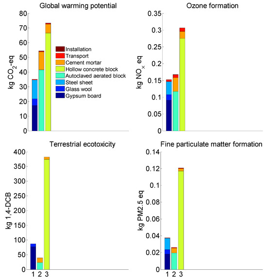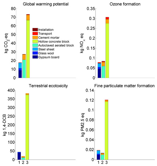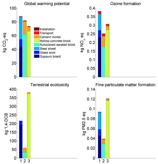 The ReCiPe2016 midpoint method includes 19 environmental impacts, such as global warming, stratospheric ozone depletion, ionizing radiation, ozone formation (human health), ozone formation (terrestrial ecosystem), fine particulate matter formation, terrestrial acidification, freshwater eutrophication, marine eutrophication, terrestrial ecotoxicity, and freshwater ecotoxicity. In this study, we focused on four of them: global warming potential, ozone formation, terrestrial ecotoxicity, and fine particulate matter formation. These were chosen because gypsum board, autoclaved aerated concrete, and hollow blocks had the greatest association with these impacts [30]. This was confirmed in the study presented by Silva et al. [35] who assessed the environmental impacts of a range of building materials, such as concrete, mortar, gravel, steel, and ceramics. The authors concluded that global warming, fine particulate matter formation, ozone formation, and terrestrial ecotoxicity are the major impacts associated with direct emissions and the combustion of fossil fuels during the production of these products.