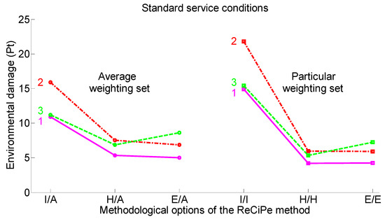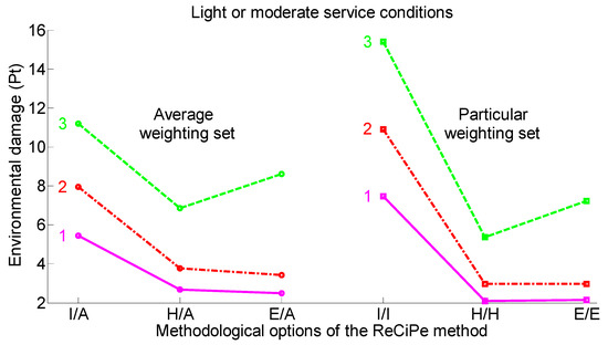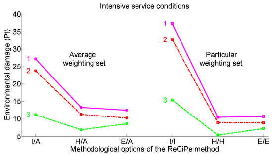 Moreover, similar variability in the selection of the most environmentally friendly alternative with different methodological options of Eco-indicator 99 (the predecessor of ReCiPe2016) has been identified in other industries [49,50]. For example, Cordella et al. [49] compared two beer packaging options: bottles and kegs. The authors found that kegs are more environmentally friendly than bottling for E/E and H/H, while bottling is more environmentally friendly than kegs for I/I. Cordella et al. [49] concluded that every methodological option has a different time horizon, normalization factors, and weighting and, as a result, can lead to different results.