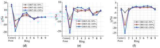 As shown in Figure 3a, it can be seen that the influence of the suspended equipment on the Umax of the reticulated shell structures shows a fluctuating trend. To provide a clearer analysis of the influence of suspended equipment, in this paper, the seismic influence coefficient γ of the suspended equipment on the reticulated shell structure is used to express the influence of the suspended equipment on the deformation of the reticulated shell structures under all levels of seismic loading, as shown in Equation (7), where and are the maximum relative displacements of the nodes in the reticulated shell structures before and after the addition of the suspended equipment, and γj represents the seismic influence coefficient of suspended equipment on the j-th ring nodes in the reticulated shell structure, as shown in Equation (8).