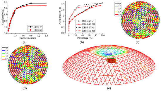 Comparisons of seismic responses of D8053 with suspended equipment. (a) Umax-PGA. (b) Proportion of the plastic shell member-PGA. (c) Plastic members distribution of D805-W under 2.2 g. (d) Plastic members distribution of D805-SE under 2.2 g. (e) Deformation of D805-SE under 2.4 g (the loading time is the 18th second).