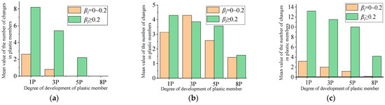 On the other hand, the suspended equipment with steel cables has a significant impact on the mounting node displacement and the distribution of plastic shell members around mounting nodes. As shown in Figure 13a–c, under longer-period ground motion (GM8-GM-14), the suspended equipment causes the proportion of 1P and 8P plastic shell members in the first ring node area of the reticulated shell structure to be significantly higher than that under ordinary ground motions (GM1-GM-7). Based on the above analysis, it is found that longer periods ground motions are more likely to cause local damage to the area near the mounting nodes of the reticulated shell structures with suspended equipment and can even change the failure mode under strong earthquake.