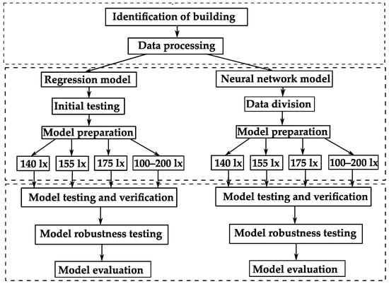 This section describes the use of predictive models to predict lighting consumption in the 100–200 lx range. Using a similar approach to the previous sections, a predictive model has been developed based on regression analysis and artificial neural networks.