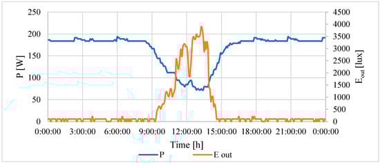 Since the predicted value for off lighting was 163 W for each intensity, but the actual measured values were different (130 lx: 124 W, 160 lx: 145 W, 190 lx: 207 W), the ANN coefficients were corrected, so that, for small intensity values, the predicted value was at the level corresponding to the measurement. This approach was possible because the lighting was switched on and the external intensity was zero, which did not affect the prediction function. The coefficients were only adjusted for the outdoor intensity range of 0–200 lx. The following