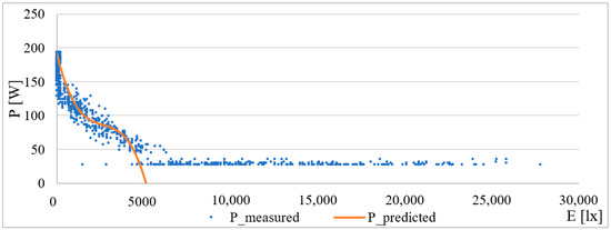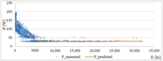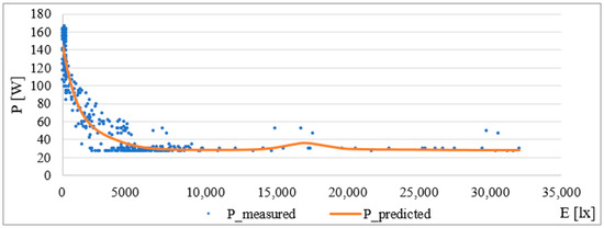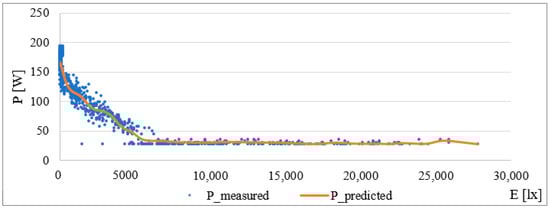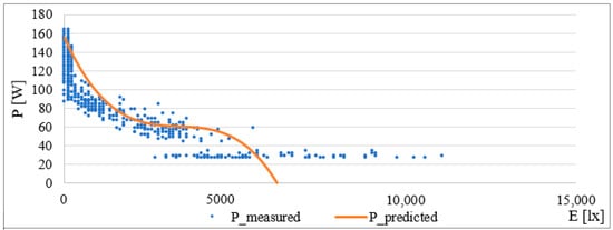During the verification process, it was discovered that, due to the wide range of values for the switched-on lighting (E = 0 lx), the model approximation set the level of the consumed current to 163 W for the given value. A problem arises because these values are not comparable for higher or lower values of the set intensity, which leads to the introduction of a large error.
