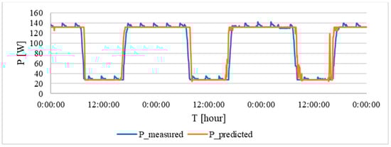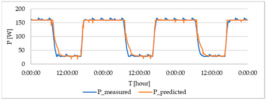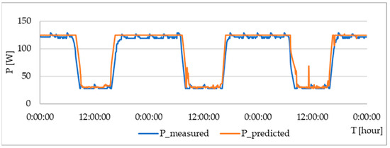 Table 10, shown below, presents a summary of the error metrics for the algorithm. The verification was carried out in a similar way as those undertaken above for the verification of prediction functions (Equations (16)–(18)). In the following figures, the curve of the electric current is measured and calculated, according to Equations (19) and (20) for three selected values (130, 160 and 190 lx). The blue curve represents the measured values and the orange curve represents the calculated values, according to Equations (19) and (20). In the following