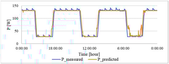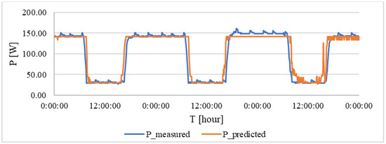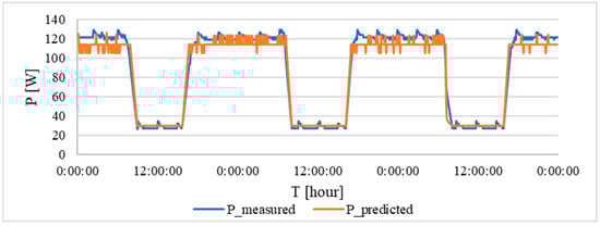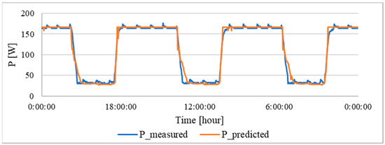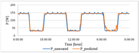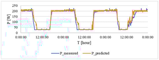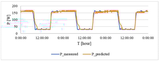 The results show that a waveform has been achieved that passes through the centre of the measured data. This indicates an optimum relationship between input and output. Due to the greater variance of the input data, lower accuracy values were obtained than for the individual models. Overall, the following parameters were achieved: a RMSE of 12.83 W, a correlation coefficient of 0.863 and an R2 coefficient of 0.744. From these data, it can be seen that, even for a given range, a high level of prediction is still achieved.