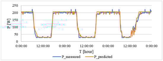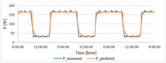 These results indicated that the corrected algorithm was well-designed and capable of accurately predicting energy consumption across the entire range of input values. Notably, even at the maximum illumination level of 230 lx, the corrected algorithm maintained a low error rate of 9.4% and a RMSE of 9.47 W. This highlights the algorithm’s robustness and ability to deliver accurate predictions beyond its training range.