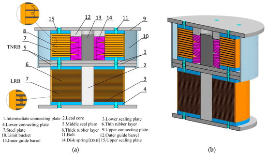The novel three-dimensional isolation system is composed of thick rubber bearings (TNRB), disc spring bearings (DSB), and laminated rubber bearings (LRB) in series. Both laminated rubber bearings (LRB) and thick rubber bearings (TNRB) are made of alternating layers of thin steel plates and rubber sheets after high-temperature vulcanization. The difference is that thick natural rubber gaskets are used in thick rubber bearings (TNRB). The vertical stiffness value of TNRB will be changed by the adjustment of the number of thick rubber gaskets and the thickness of the rubber layer.
