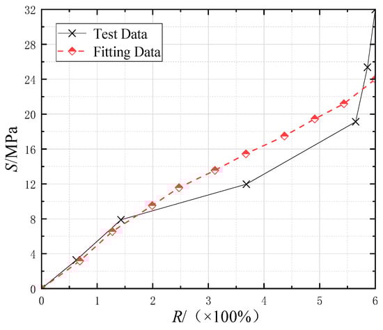In the above formula, D1 indicates whether the material can be compressed, and D1 = 0 is a special case that means the material is incompressible. In this experiment, D1 is not 0; I1, I2, and J are related to the primary elongation λ1, λ2, λ3. I1 = λ12 + λ22 + λ32, I2 = (λ1λ2)2 + (λ2λ3)2 + (λ1λ3)2, J = λ1λ2λ3. I1 and I2 are invariants of deformation tensors. C1 and C2 are parametric variables, calculating their specific values by fitting the curve of rubber material test data, as shown in Figure 2. In the figure, according to the uniaxial tensile or compression test, t1 (t1-rubber material principal stress) under different λ1 is measured, with R = 1/λ1 as the horizontal coordinate, with S = t1/2 (λ12 − 1/λ1) as the longitudinal coordinate, the test data is returned to a straight line with a slope of C2 and an intercept of the Y axis of C1.