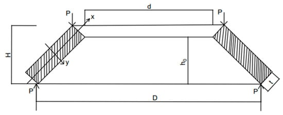 Based on engineering experience, D/d is generally taken as 1.7–2.5. DSB used in the article is offered by Jiuguang Spring Co., Ltd. (in Shanghai, China), as shown in Figure 3. The internal angle of the disc spring is β, the loading force is P, the outer diameter D is 250 mm, the inner diameter d is 127 mm, the thickness t is 14 mm, the free height H is 19.6 mm, the ultimate displacement h0 is 5.6 mm, and D/d = 1.97. According to the requirements of overall bearing capacity and overall deformation, the disc spring assembly is determined to be composed of four disc springs stacked in four pairs. Due to limited support space, the disc spring assembly needs to be preloaded with a pre-pressed amount of 5.8 mm.