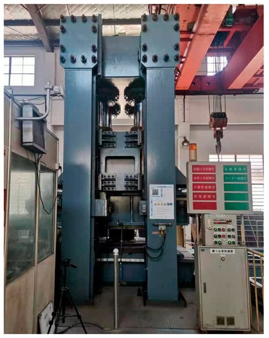 As for the relevant parameters of the test device and specimens, since the tests of several support models in our research group were completed together, the test device used was the same as some specimens, and some parameters were referred to another article published by the research group []. Vertical parametric variables of compression shear test apparatus are a maximum vertical pressure of 20,000 kN, maximum vertical tension of 6000 kN, maximum vertical displacement stroke of 700 mm, and maximum speed of 3 mm/s. The horizontal parameters are a maximum shear test force of ±6000 kN, displacement stroke of ±600 mm, and maximum speed of 10 mm/s. The experimental equipment loading device test diagram is shown in Figure 4 below.