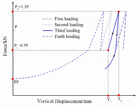 In view of the design surface pressure of 12 MPa and the bearing diameter of 600 mm, determine the specified vertical load P (3400 kN). Firstly, conduct a vertical compression function experiment and perform four times recurrent loading within the range of P ± 0.3P. The loading mode diagram is displayed in Figure 5.