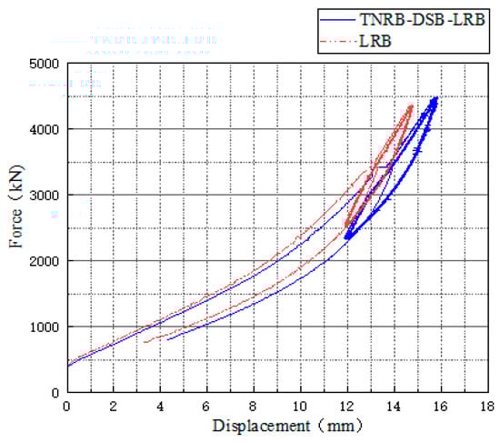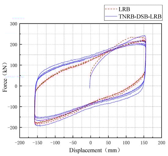 Under the condition of shear displacement h of 156 mm and loading frequency of 0.01 Hz, one 100% shear strain horizontal shear performance experiment was conducted on two supports. The experiment also underwent four cycles of loading. The hysteresis curves of the supports obtained from the experiment are displayed in Figure 8, and we can see that the hysteresis curves of both supports show a full shuttle shape. After calculation, the area of the hysteresis energy dissipation curve of the 3D isolation support is 7.1% higher than that of the LRB600 bearing, indicating that TNRB-DSB-LRB has a certain horizontal energy dissipation capability and is slightly better than the LRB600 bearing.