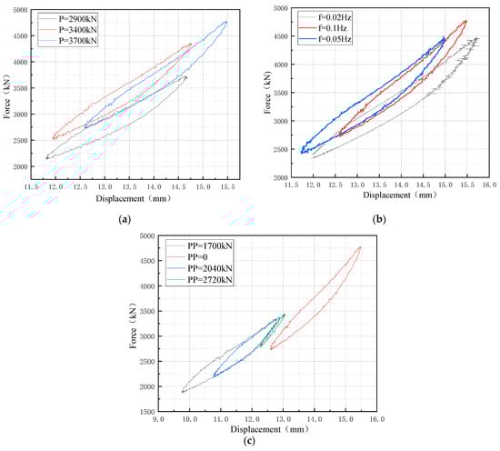 For the sake of analyzing the correlation between vertical performance and compressive stress of three-dimensional supports, we extracted third-cycle outcomes of the vertical compression load–displacement curve of the 3D bearing with various vertical pressures, loading frequencies, and pre-pressures and also drew the shear strain compression stress diagram, as shown in Figure 7a–c. We analyzed the effects of various working circumstances on the vertical stiffness of the three-dimensional bearing.